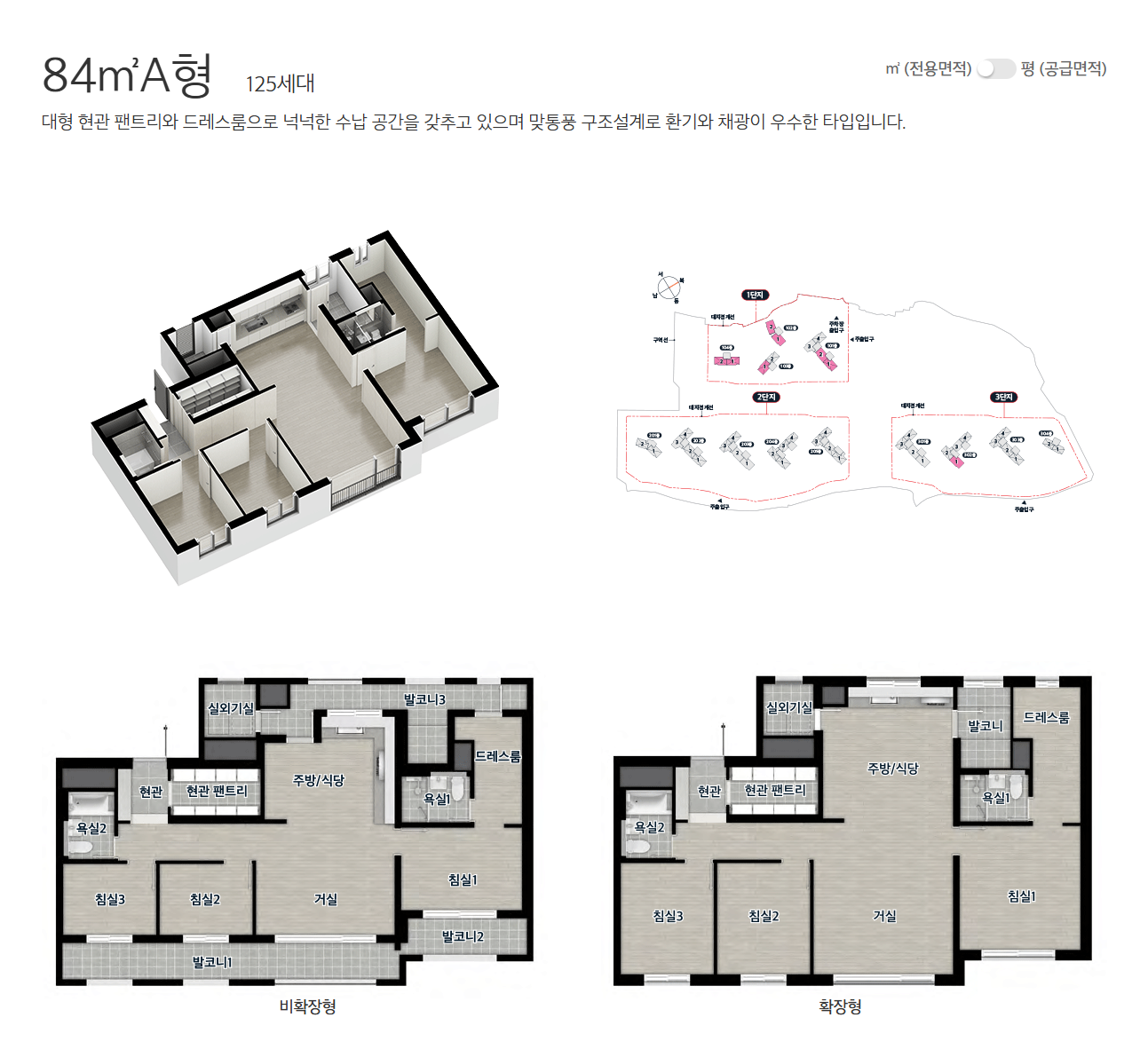 전용 59㎡·84㎡의 중소형으로만 구성했고 두 타입 모두 4베이 판상형입니다. 특히 84A는 맞통풍이 가능한 동선, 드레스룸·현관 팬트리·연결형 다이닝으로 가사 효율이 높습니다. 태양광 발전, 실별 온도 제어, 전열교환 환기, 홈 IoT로 마감한 스마트 설계는 실거주 만족도를 끌어올립니다. 소형이라도 수납과 환기, 동선에서 불편을 줄이는 설계가 일산 이편한세상 메이포레 의 경쟁력입니다.