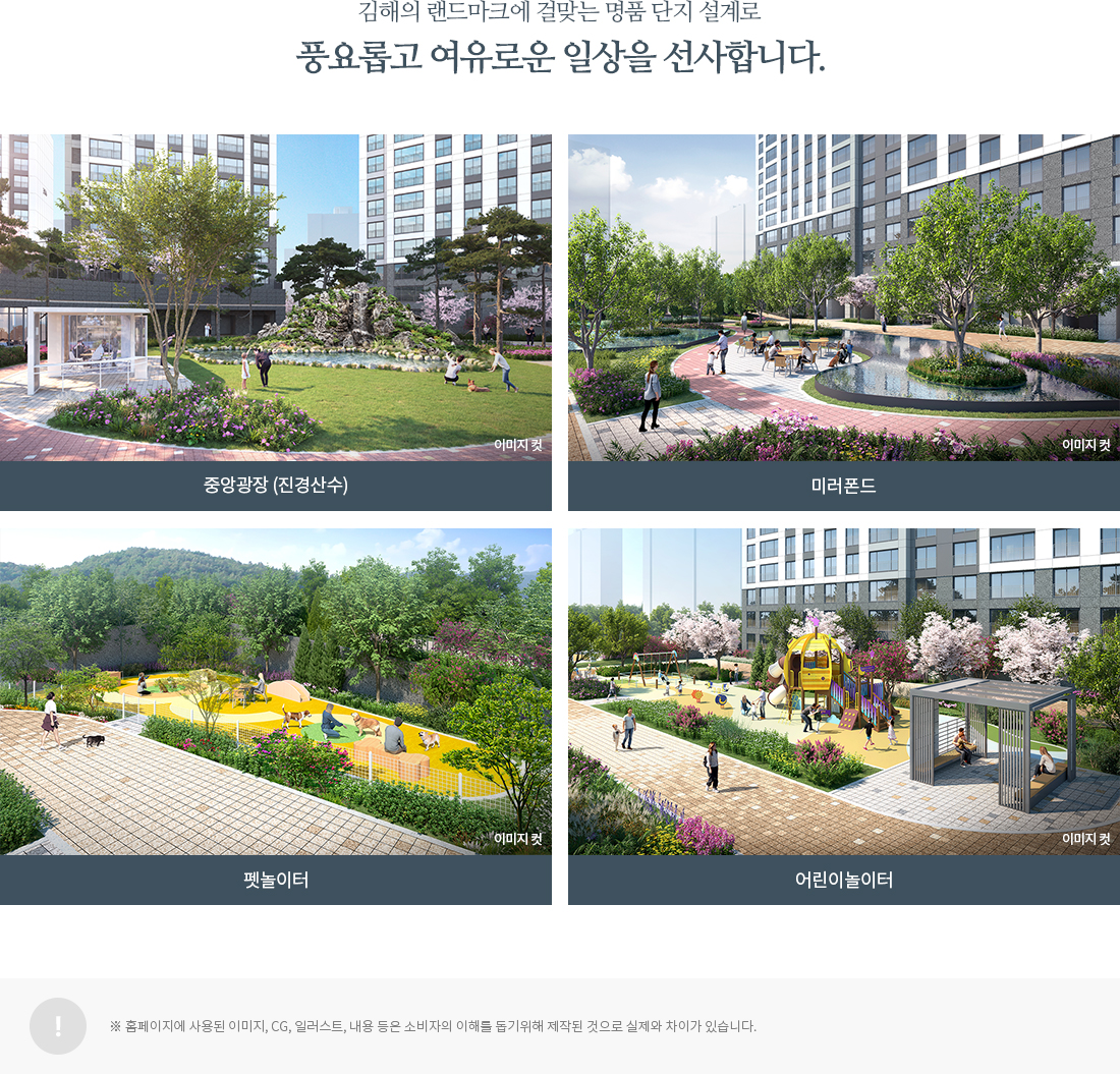 지상은 차량 동선을 최대한 배제하고 보행 중심으로 꾸몄습니다. 중앙광장과 수공간, 티하우스, 미러 폰드가 자연스러운 산책 동선을 만들고, 어린이 놀이터·야외 트레이닝 파크 등 연령대별 휴식·운동 공간을 촘촘히 배치했습니다. 남향 위주 배치와 동간 이격으로 사생활 보호와 채광, 조망을 모두 잡은 점이 김해 테크노밸리 제일풍경채의 주거 쾌적성 핵심입니다.