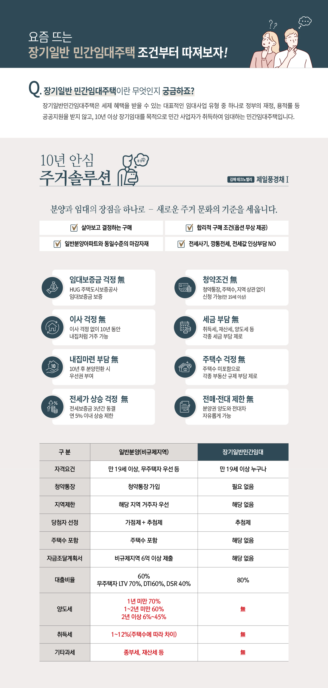 공공지원 민간임대는 보증보험 가입 의무, 임대료 인상률 제한, 취득·보유세 부담 없음, 장기 거주 후 분양전환 가능성이 결합된 상품입니다. 전세 사기 리스크를 우려하는 분들이 “보증·임대료·이사 유연성” 측면에서 안심하고 선택할 수 있는 제도적 틀이 김해 테크노밸리 제일풍경채에 적용됩니다. 특히 10년 장기 거주가 가능해 교육·직장 계획이 잦은 가정에도 유연합니다.