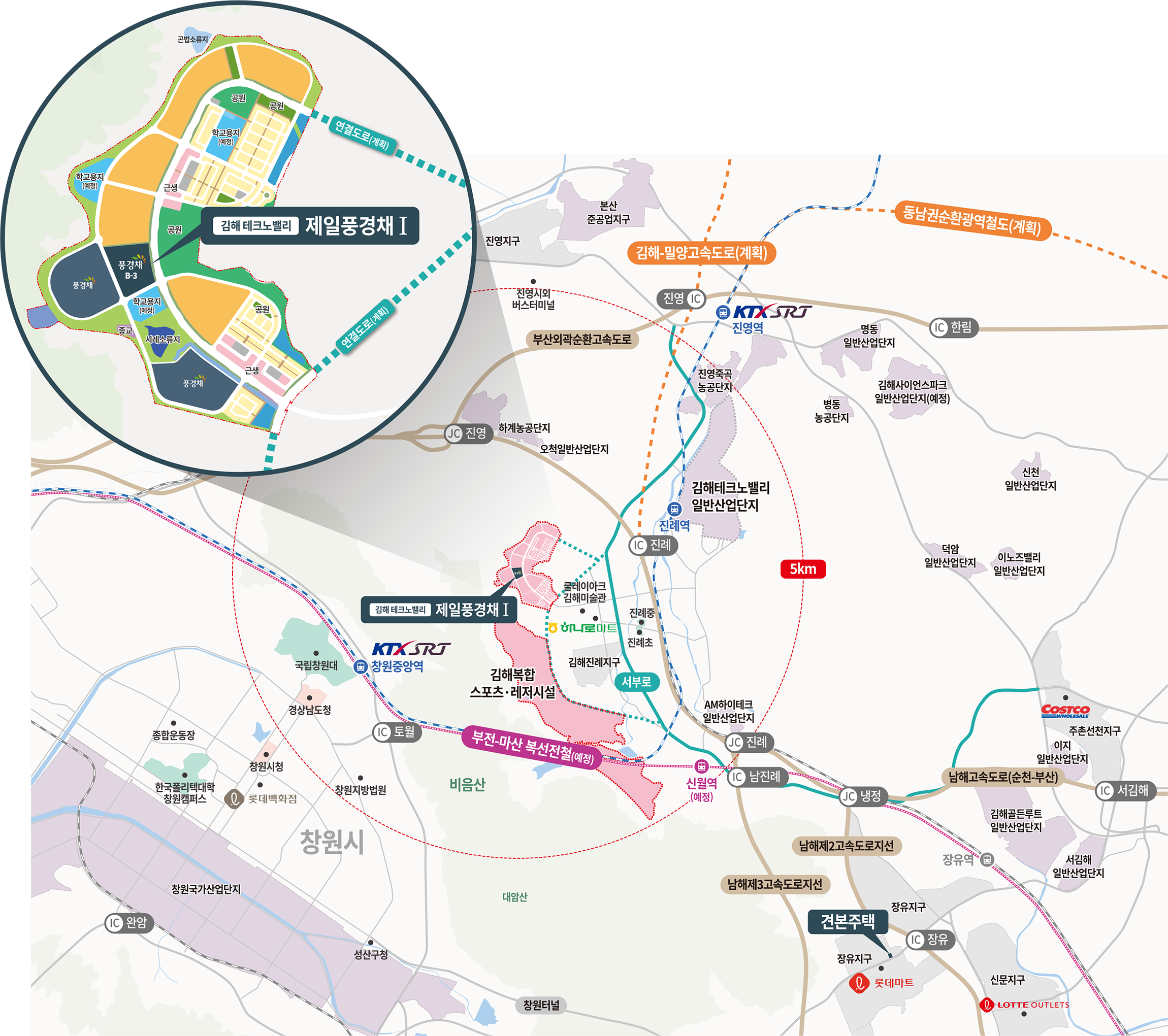 메인 도로변 입지로 차량 동선이 단순합니다. 진례IC에서 남해고속도로 지선·부산외곽순환고속도로를 빠르게 타고, 진영역을 통한 KTX·SRT 이용으로 광역 이동이 수월합니다. 계획 중인 신월역(부전~마산 복선전철 중간 거점)과 비음산터널(진례—창원 연계) 호재는 통근권을 더욱 넓혀 줄 요소로 거론됩니다. 김해·창원 제조·첨단밸리와의 접근성이 보여 주듯 김해 테크노밸리 제일풍경채는 “매일의 출퇴근”에서 체감 이득이 큰 단지입니다.