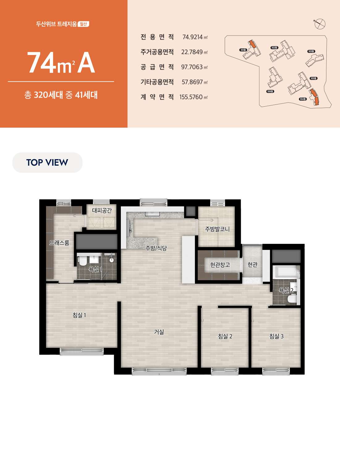 실수요 선호가 높은 74·84㎡ 중소형으로 구성됐고, 특히 84㎡는 A~D 네 가지 타입으로 세분화했습니다. 84A·B는 4베이 판상형으로 거실·주방 맞통풍, 침실 전면 남향 배치가 장점입니다. 84C·D는 타워형 특성을 살려 침실 간 이격을 키워 프라이버시가 좋고, 가족 공용공간은 넓게 연출했습니다. 타입 공통으로 드레스룸·현관창고·다용도실 등 수납 특화를 강화해 체감 면적을 키운 것이 두산위브 트레지움 월산의 강점입니다.
