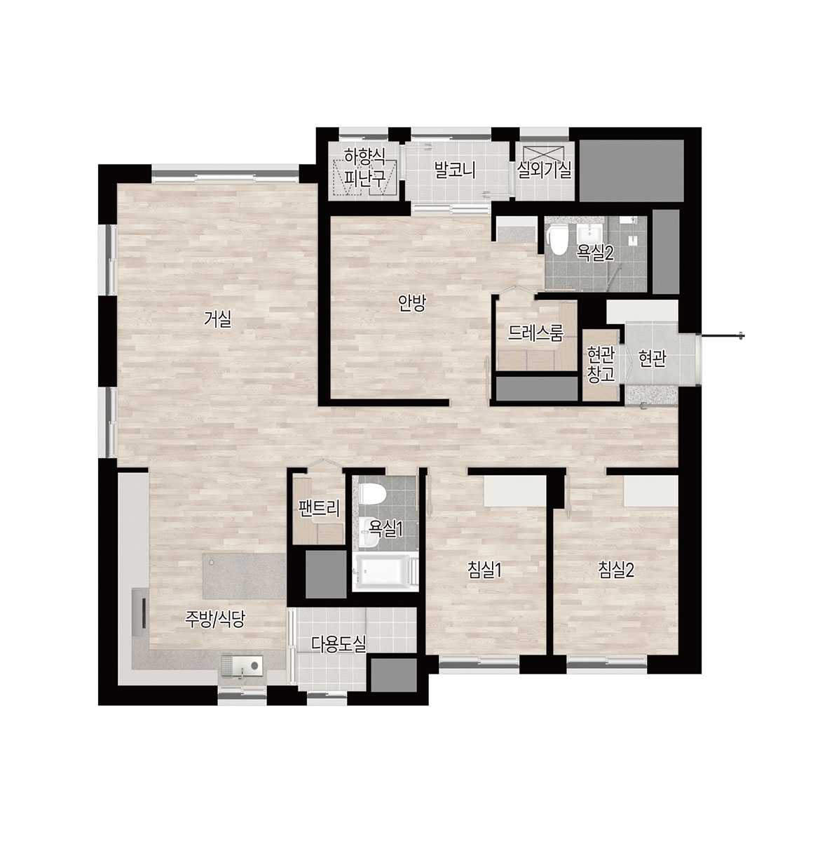 주력 면적은 59, 77, 84제곱미터로, 실수요가 두터운 중소형 구간을 집중 공략했습니다. 84형은 4베이 판상형 중심의 평면을 통해 거실 전면 폭과 채광을 확보했고, 대면형 주방과 다용도실 직결 가사 동선으로 체류 시간을 효율화했습니다. 현관 창고, 팬트리, 드레스룸을 적재적소에 배치해 수납 압력을 낮췄고, 일부 타입은 가변 벽체를 적용해 생애주기 변화에 따른 공간 전환이 수월합니다. 59형은 발코니 확장 시 체감 거실 폭이 커져 30평대 구축을 대체하려는 수요에도 대응합니다. 마감과 설비는 거실·주방의 개방감을 살리는 창호 비례, 건식과 습식의 명확한 욕실 분리, 무인 택배와 원패스 출입 등 생활 디테일에 힘을 준 구성이 눈에 띕니다.