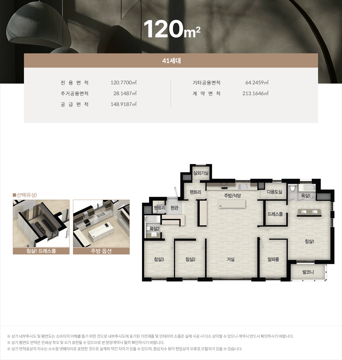 수요가 가장 두터운 전용 84㎡가 약 88%를 차지하며 A·B·C로 세분화되었습니다. 84A·84B는 판상형으로 맞통풍과 자연채광에 유리하고, 광폭 주방과 2.5m 층고가 개방감을 확장합니다. 84C는 타워형으로 이면창을 통해 채광을 강화하고 광폭 드레스룸·팬트리로 수납을 극대화했습니다. 중대형인 113·120㎡는 알파룸과 현관 창고, 오픈 발코니로 취미·재택·수납 활용도를 키웠고, 펜트하우스 160㎡는 4침실·2드레스룸·서재·2개 테라스로 하이엔드 라이프를 구현합니다. 실내 전 세대 유리 난간, 층간소음 저감 바닥, 전열교환 환기 등 쾌적성을 위한 기본기도 탄탄합니다. 여주역 로제비앙 더센텀이 상품성에서 한 발 앞선 이유입니다.