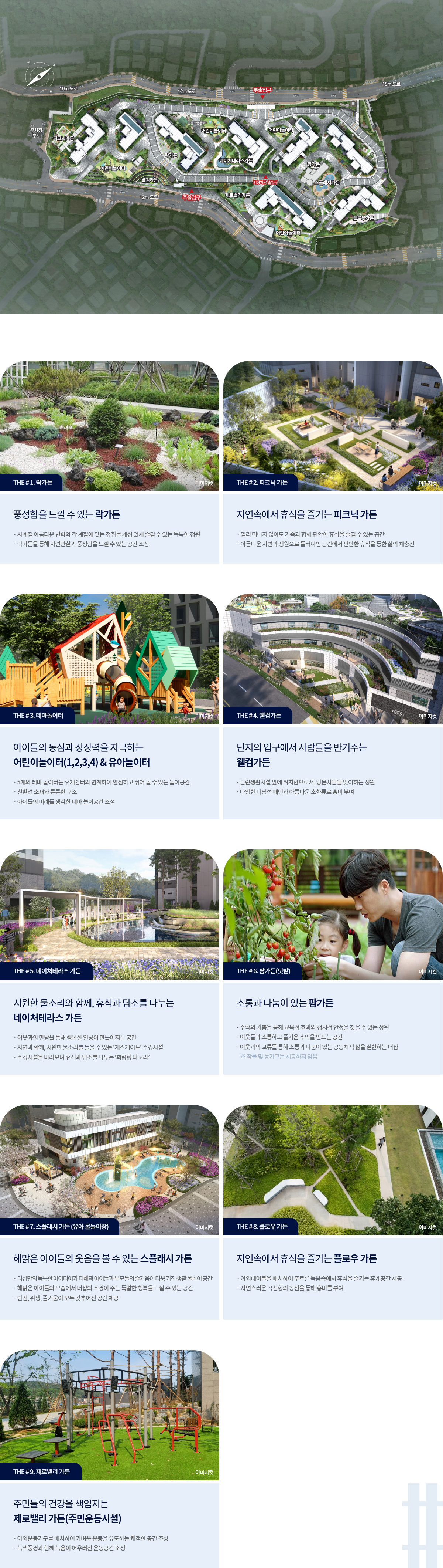 100퍼센트 지하주차를 지향하는 계획으로 지상의 보행 동선은 안전하고, 중앙보행축을 따라 네이처테라스가든, 피크닉가든, 제로밸리가든, 스플래시가든, 팜가든 등 테마 정원이 이어집니다. 단지를 감싸는 도로에는 완충 녹지를 계획해 소음 차단과 경관을 동시에 잡았고, 넓은 동간 거리와 남향 위주 배치로 채광과 조망을 살렸습니다. 더샵 당리 센트리체가 공원형 단지를 표방하는 이유를 현장에서 체감할 수 있었습니다.