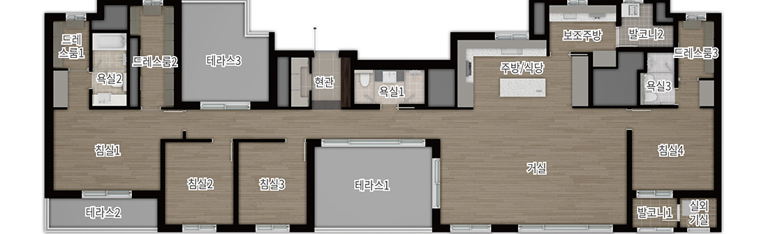실수요가 가장 선호하는 중형(전용 84㎡)을 주력으로 115㎡, 펜트하우스(134㎡ 이상)까지 준비해 선택 폭을 넓혔습니다. 더샵 광양레이크센텀의 84㎡ A~C는 4Bay 판상형에 맞통풍이 가능한 구조라 채광·환기 효율이 뛰어나고, 알파룸을 서재·취미실로 활용하기 좋습니다. ㄷ자 주방과 창 있는 드레스룸을 채용해 수납과 습기 관리가 수월합니다. 84㎡ D는 2Bay 타워형으로 LDK 일체형 거실이 주는 개방감이 돋보이며, ㄱ자 주방과 다용도실의 짧은 동선 덕분에 가사 효율이 높습니다. 더샵 광양레이크센텀은 타입별로 현관 수납, 팬트리, 알파룸을 세심하게 배치해 ‘수납이 넉넉한 집’을 찾는 수요에게 분명한 대안을 제시합니다.