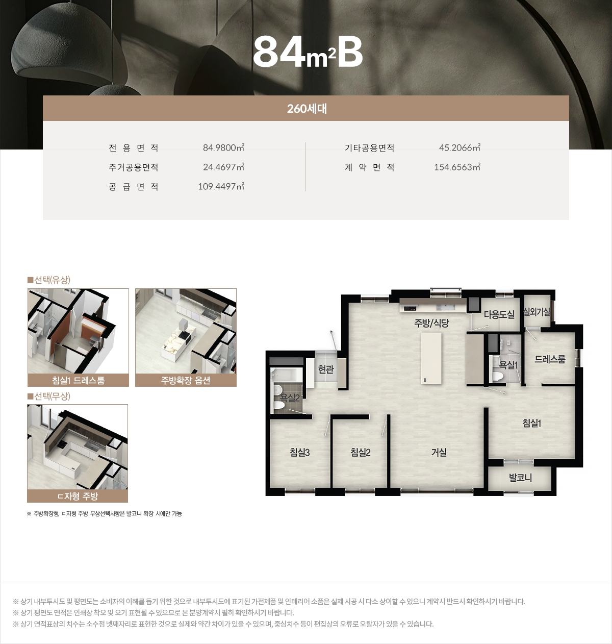 수요가 가장 두터운 전용 84㎡가 약 88%를 차지하며 A·B·C로 세분화되었습니다. 84A·84B는 판상형으로 맞통풍과 자연채광에 유리하고, 광폭 주방과 2.5m 층고가 개방감을 확장합니다. 84C는 타워형으로 이면창을 통해 채광을 강화하고 광폭 드레스룸·팬트리로 수납을 극대화했습니다. 중대형인 113·120㎡는 알파룸과 현관 창고, 오픈 발코니로 취미·재택·수납 활용도를 키웠고, 펜트하우스 160㎡는 4침실·2드레스룸·서재·2개 테라스로 하이엔드 라이프를 구현합니다. 실내 전 세대 유리 난간, 층간소음 저감 바닥, 전열교환 환기 등 쾌적성을 위한 기본기도 탄탄합니다. 여주역 로제비앙 더센텀이 상품성에서 한 발 앞선 이유입니다.