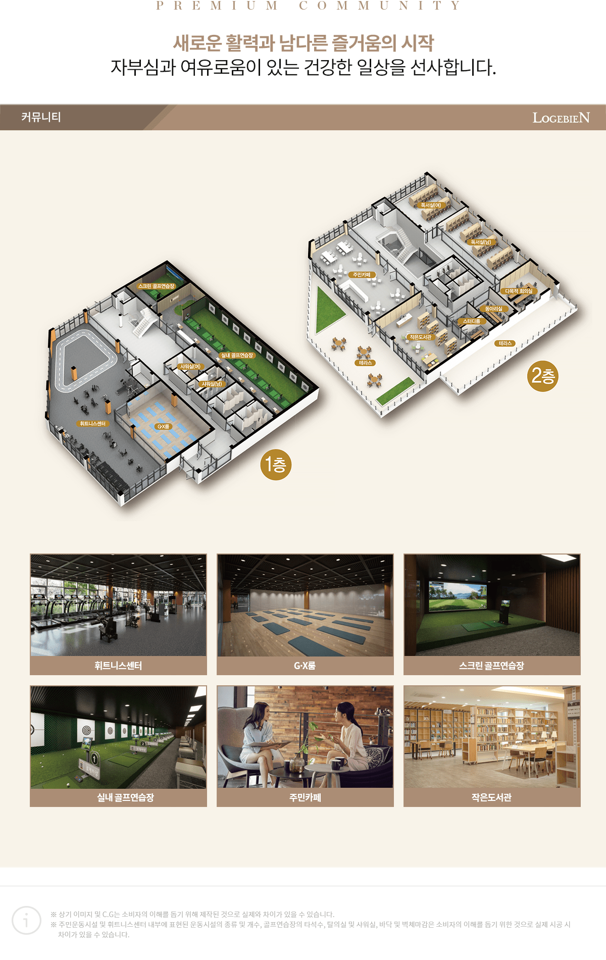 대규모 잔디마당과 테마 정원, 티하우스, 체력단련장, 어린이 놀이터 등 조경 시설을 촘촘하게 배치해 단지 안에서 머무는 시간이 자연스럽게 늘어나도록 설계했습니다. 어린이집, 통합돌봄센터, 맘스스테이션 등 주민공동시설도 밀도 있게 들어서 가족 단위 생활을 세심하게 지원합니다. 2개 층으로 구성된 커뮤니티에는 피트니스, GX룸, 실내 및 스크린골프 연습장, 샤워시설, 주민카페, 테라스, 독서실, 스터디룸, 동아리실 등 일상과 취미, 학습을 모두 담았습니다. 이처럼 용인 고진역 대광로제비앙은 단지 안에서 하루 대부분을 해결하는 생활 생태계를 지향합니다.